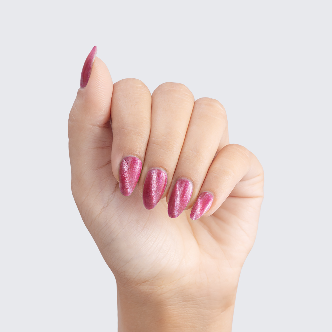 Deep magenta. Medium-dark. Pale pink magnetic shimmer. Opaque. Warm undertone.